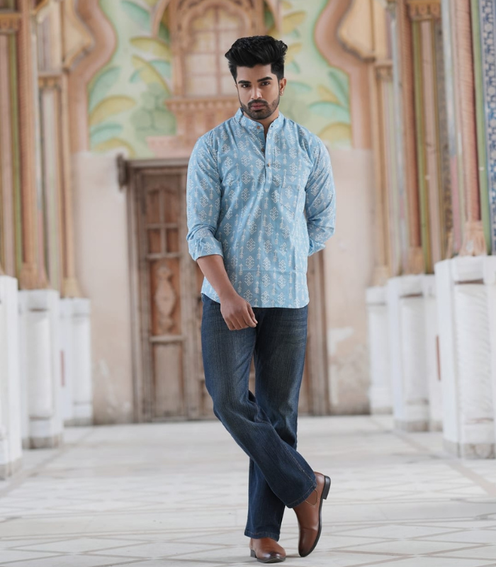 7 Stylish Men’s Blue Printed Cotton Kurta Shirt – Premium Handcrafted Comfort